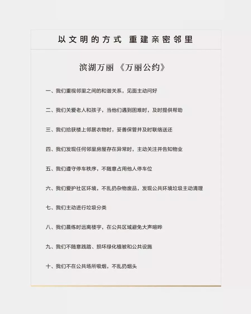 德谟克利特说凡事都有规矩。万丽会是在对的时间、对的地点,由一群对的人,因为相同的生活信仰而共同创造出的生命状态,代表着万丽每位业主、每个家庭价值观共识的《万丽公约》由此诞生。作为烟台首个由业主参与制定的社区公约,以共同价值观作为精神纽带,连接美好生活的一切。我们兴奋于越来越多热爱生活的人,与万丽会连接,从邻居成为朋友,从朋友变成邻居,彼此温暖,照耀前路。